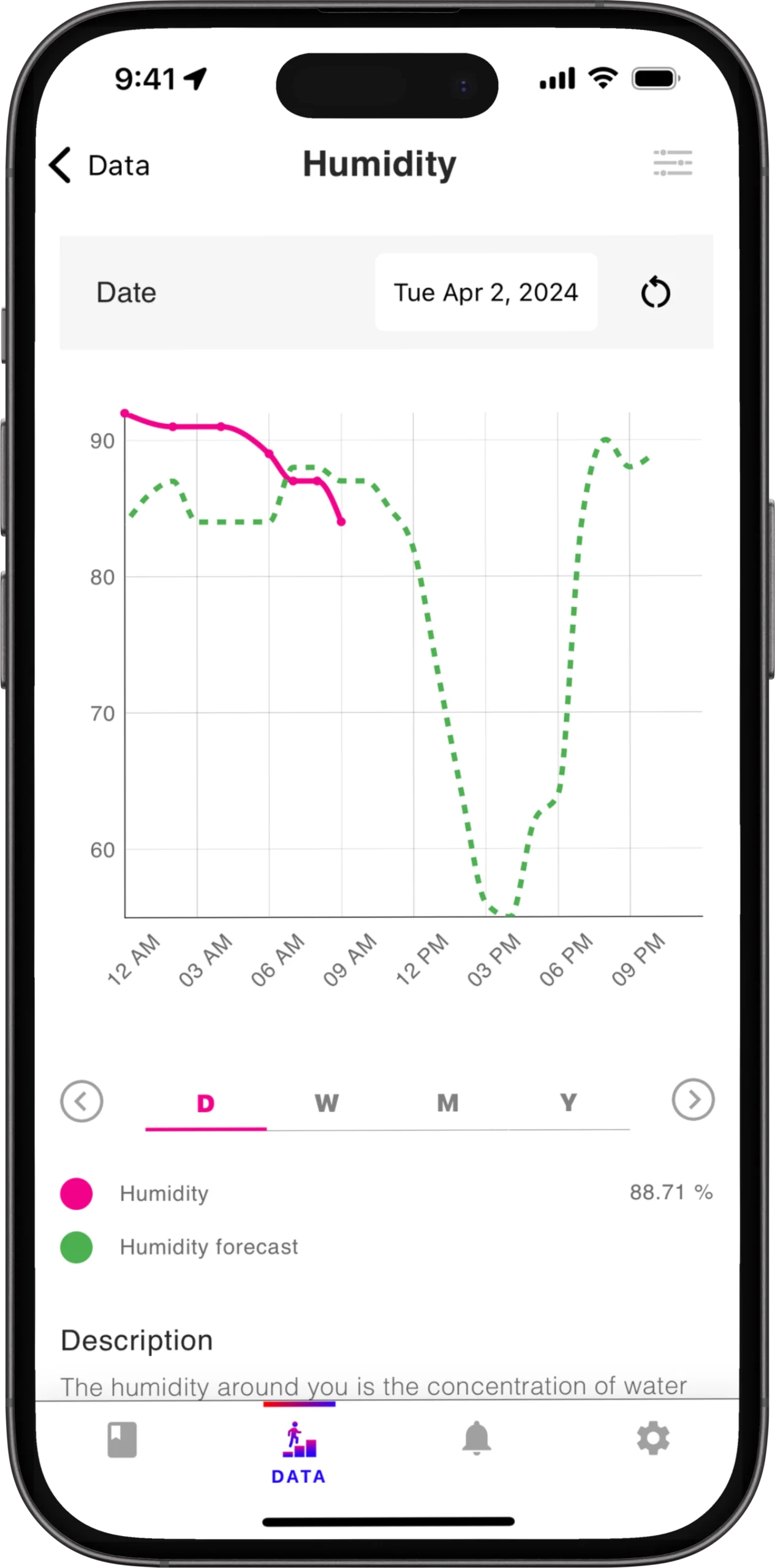 - Environmental Forecast Integration: Looking ahead, the app now includes forecasts in the environment graphs, providing you with a glimpse into future conditions that could affect your health and plans.